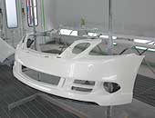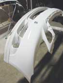サンディング後、ワックス等を除去(脱脂)してからサフェーサー(ウレタン系2液プラサフ)を吹きつけ、エアロ表面を更に円滑にし、しっかりとした下地を作ります。